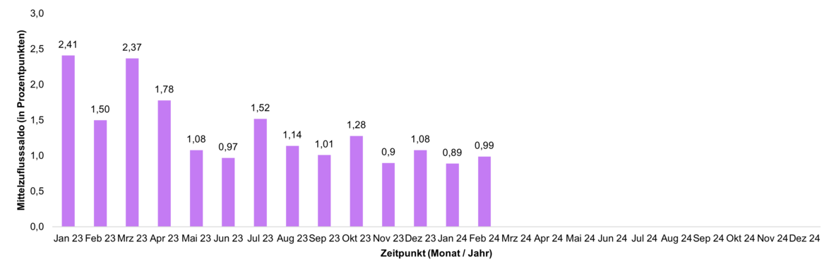 Veränderungen der Mittelzuflüsse und Mittelabflüsse werden über den Fundflow-Faktor ausgedrückt. Dabei werden die monatlichen Mittelzuflüsse des Berichtszeitraums in Relation zu den monatlichen Mittelabflüssen gesetzt. Bei einem Fundflow-Faktor über eins überwiegen die Mittelzuflüsse, bei einem Fundflow-Faktor unter eins die Mittelabflüsse.