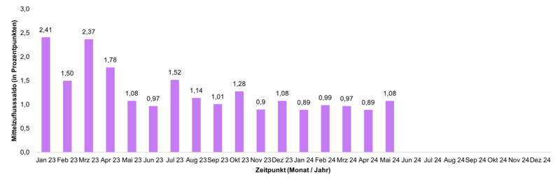 Veränderungen der Mittelzuflüsse und Mittelabflüsse werden über den Fundflow-Faktor ausgedrückt. Dabei werden die monatlichen Mittelzuflüsse des Berichtszeitraums in Relation zu den monatlichen Mittelabflüssen gesetzt. Bei einem Fundflow-Faktor über eins überwiegen die Mittelzuflüsse, bei einem Fundflow-Faktor unter eins die Mittelabflüsse.