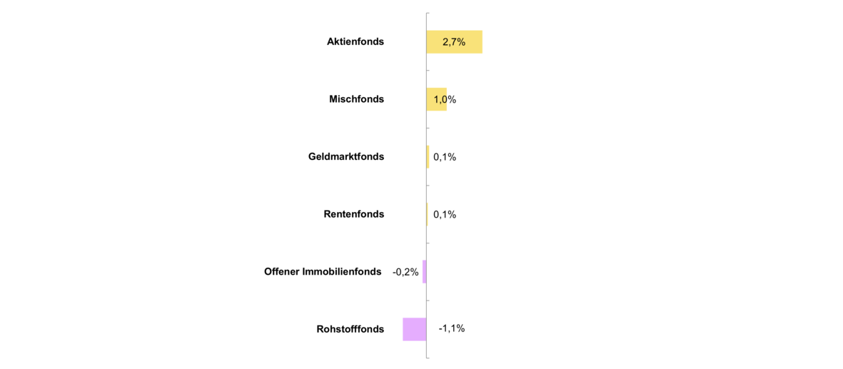 Im Februar schlossen Aktienfonds (+2,7 %), Mischfonds (+1,0 %), Rentenfonds (+0,1 %) und Geldmarktfonds (+0,1 %) mit einer positiven Performance. Offene Immobilienfonds (-0,2 %) und Rohstofffonds (-1,1 %) verzeichneten zum Monatsende eine leicht negative Entwicklung.